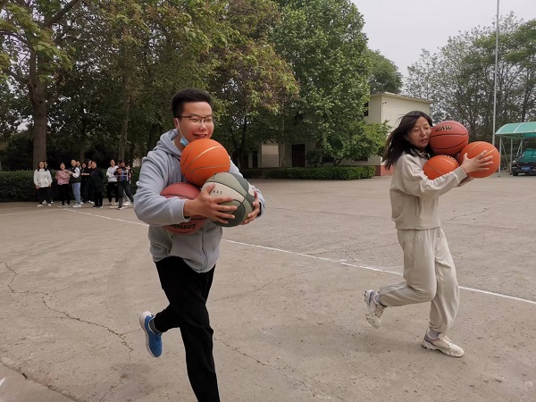 “谁先来?抱球游戏升级——1人抱4个篮球向前奔跑,过程中一个球也不得落地,否则成绩无效。”裁判之一的审计科长谈增迫不及待地宣布。“个子高的胳膊、腿长,有优势,先上。”人群里有人提议,工程科身高一米八的帅小伙刘文浩和综合办高个子王春影举手示意,跑道上呈现二人洒脱、漂亮的抱球姿势。